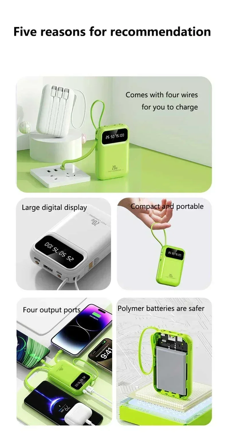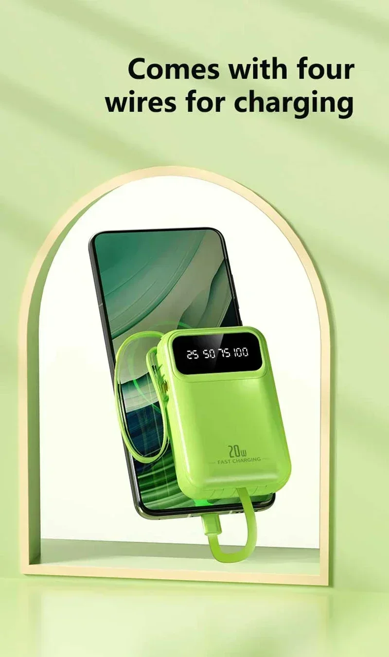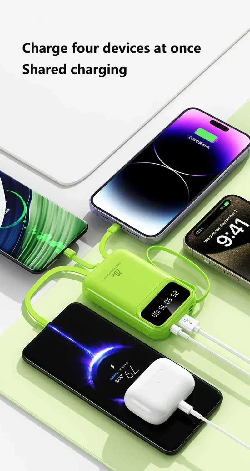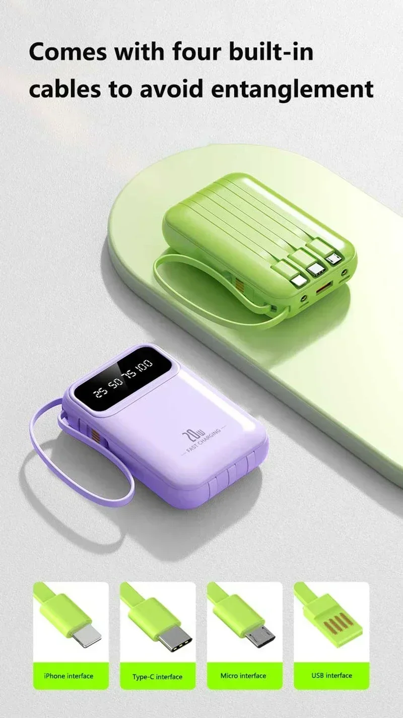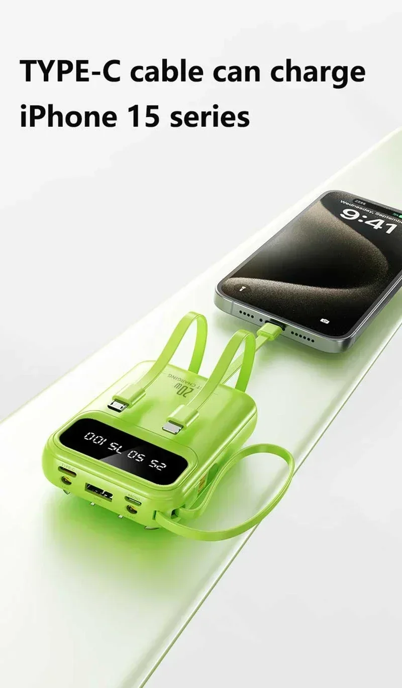 Built-in Four Cables, Multi-Device Charging: Integrates charging cables with iPhone, Type-C, Micro USB, and USB-A interfaces, compatible with 99% of digital devices on the market. No need to carry extra cables, truly achieving "one power bank for all scenarios".