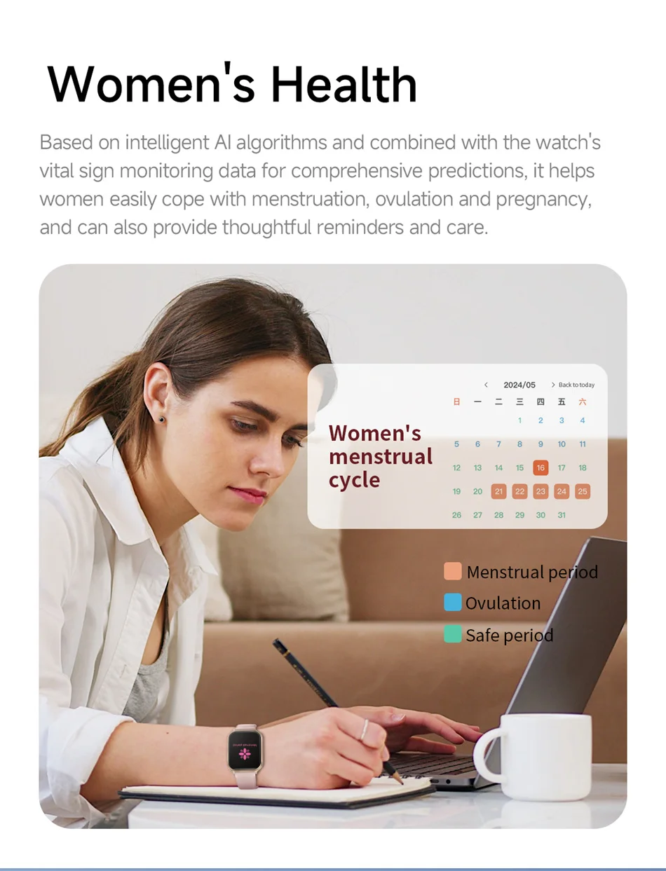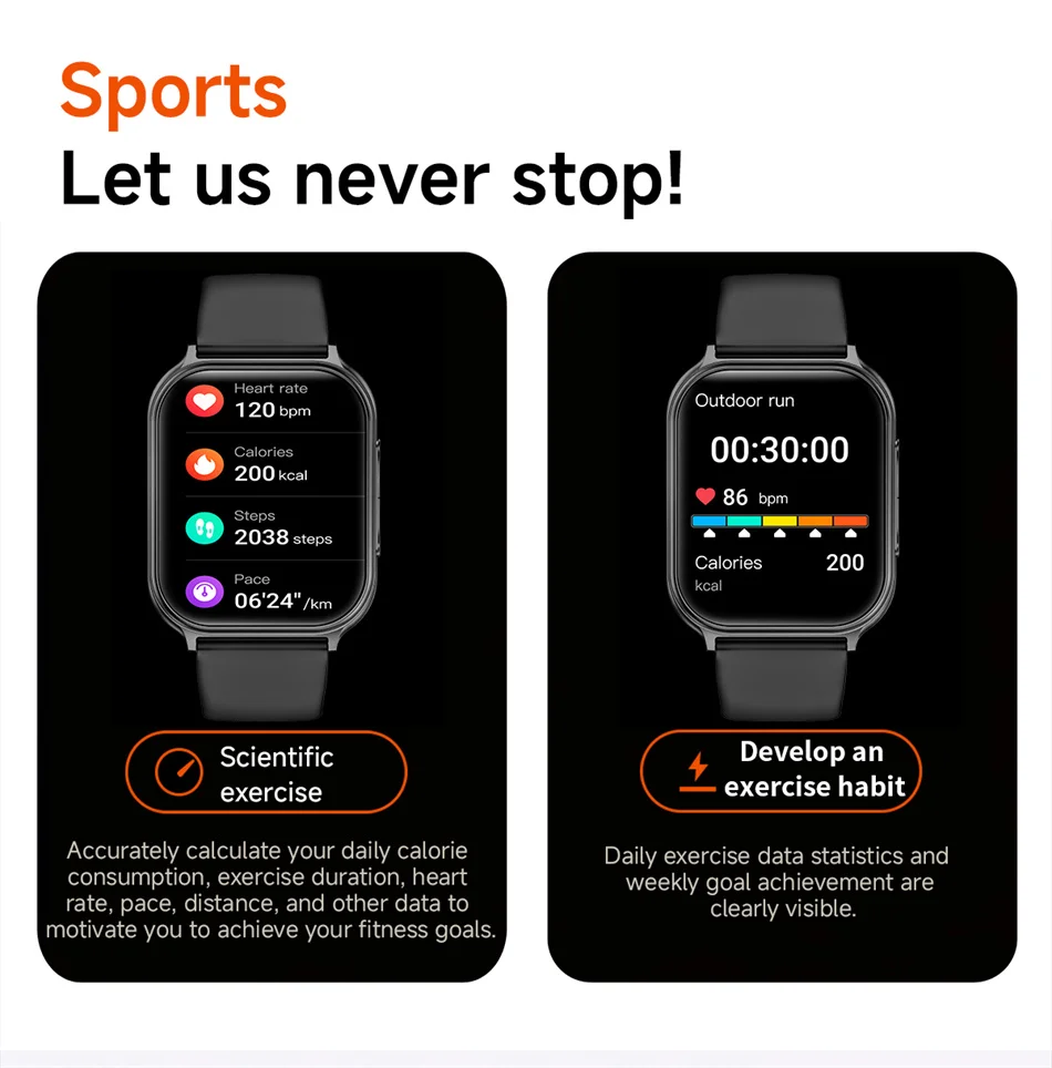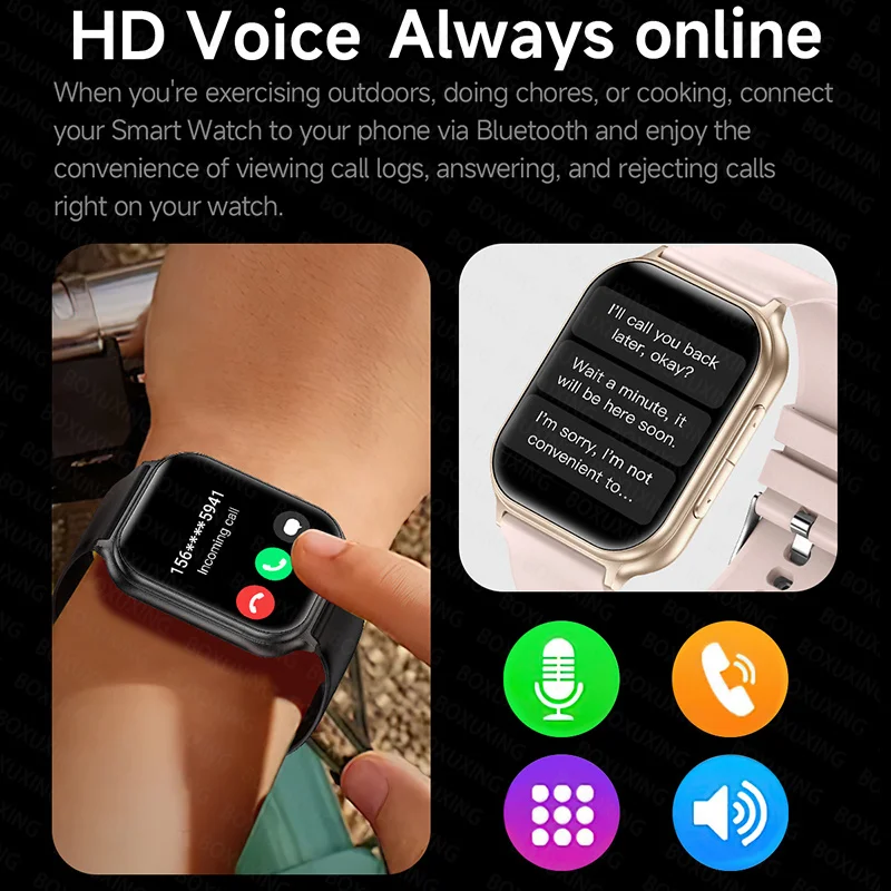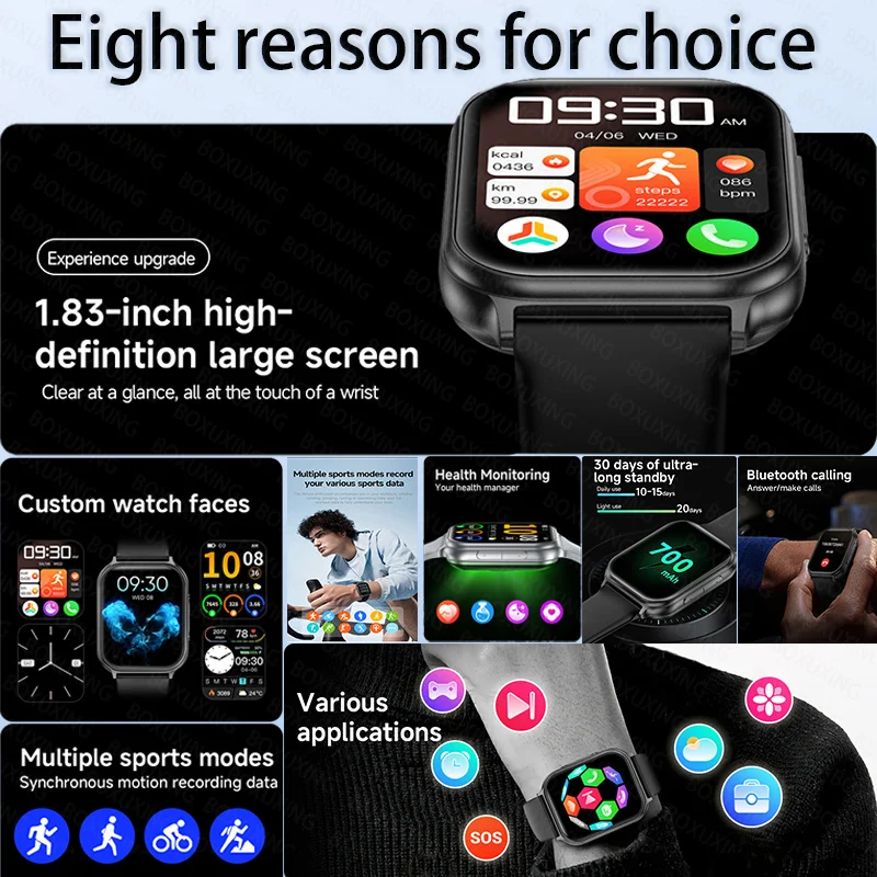 Main functions: Bluetooth calls, 100+ sports modes, health detection, IP68 waterproof, sports records (step counting, distance, calorie counting), sports modes, message push, information storage, heart rate monitoring, sleep monitoring, blood pressure measurement, blood collection Oxygen saturation measurement, stopwatch, camera control, music control, full font language, 1.7-inch color touch screen display.
