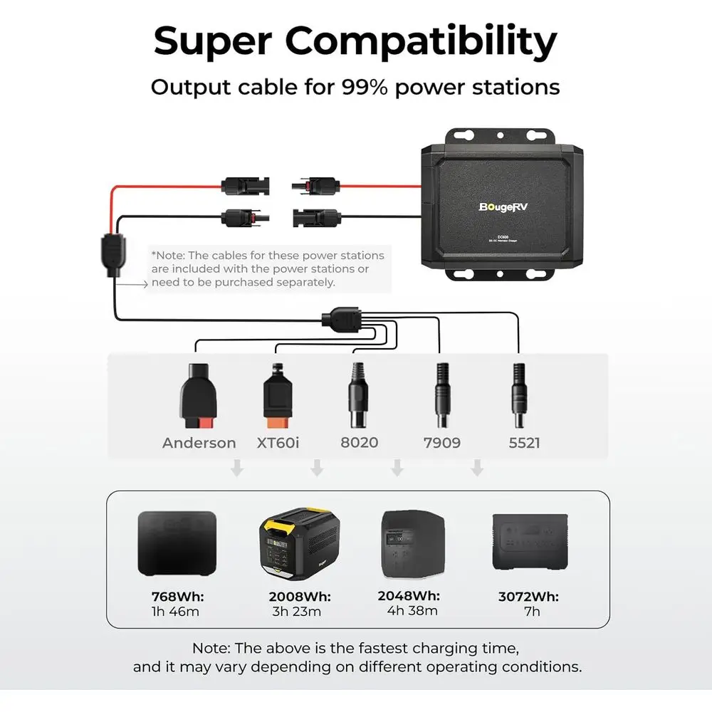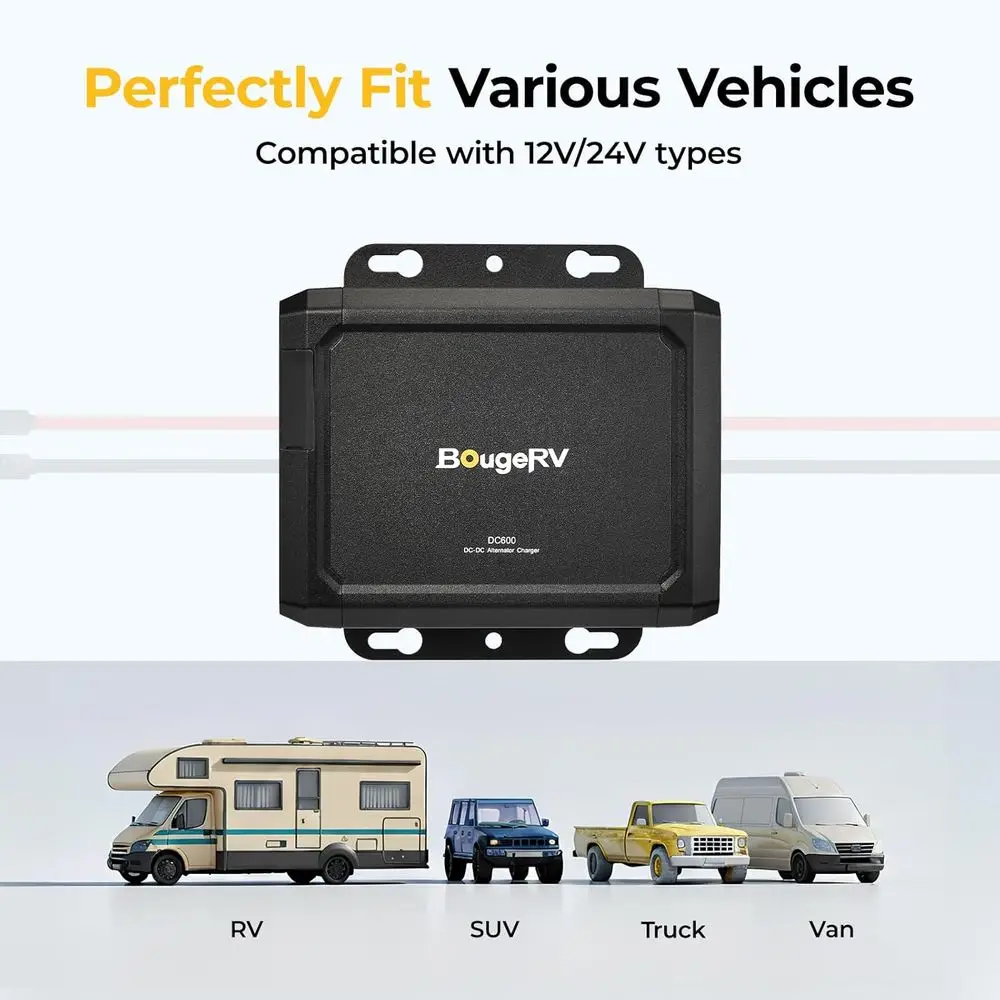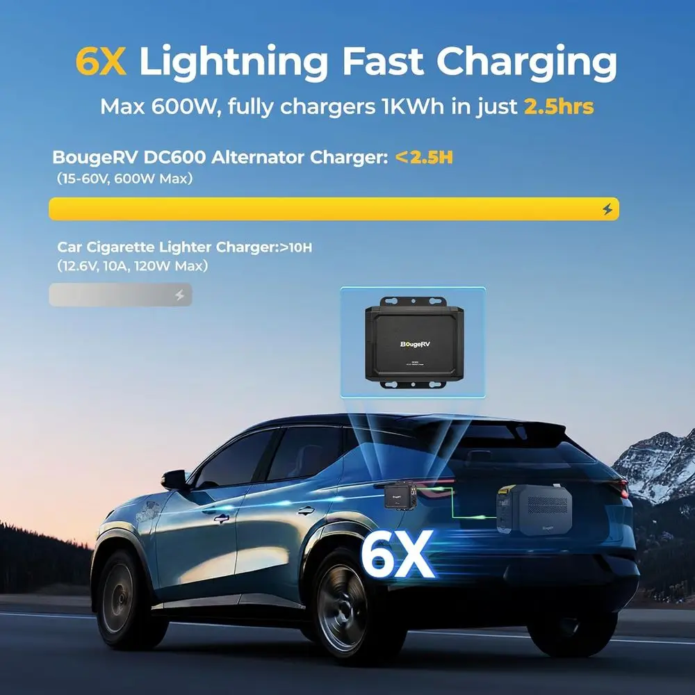 6X Faster Charger: Get 600W of charging power, up to 6X faster than standard cigarette chargers. DC-DC charger can fully charge a 1kWh portable power station in just 2.5 hours, providing a consistent and reliable charge on the go, rain or shine (Just for portable power station, not for LiFePO4 battery. DC600 is a strictly one-way alternator charger. So it can’t use to have your power station recharge your vehicle’s battery)