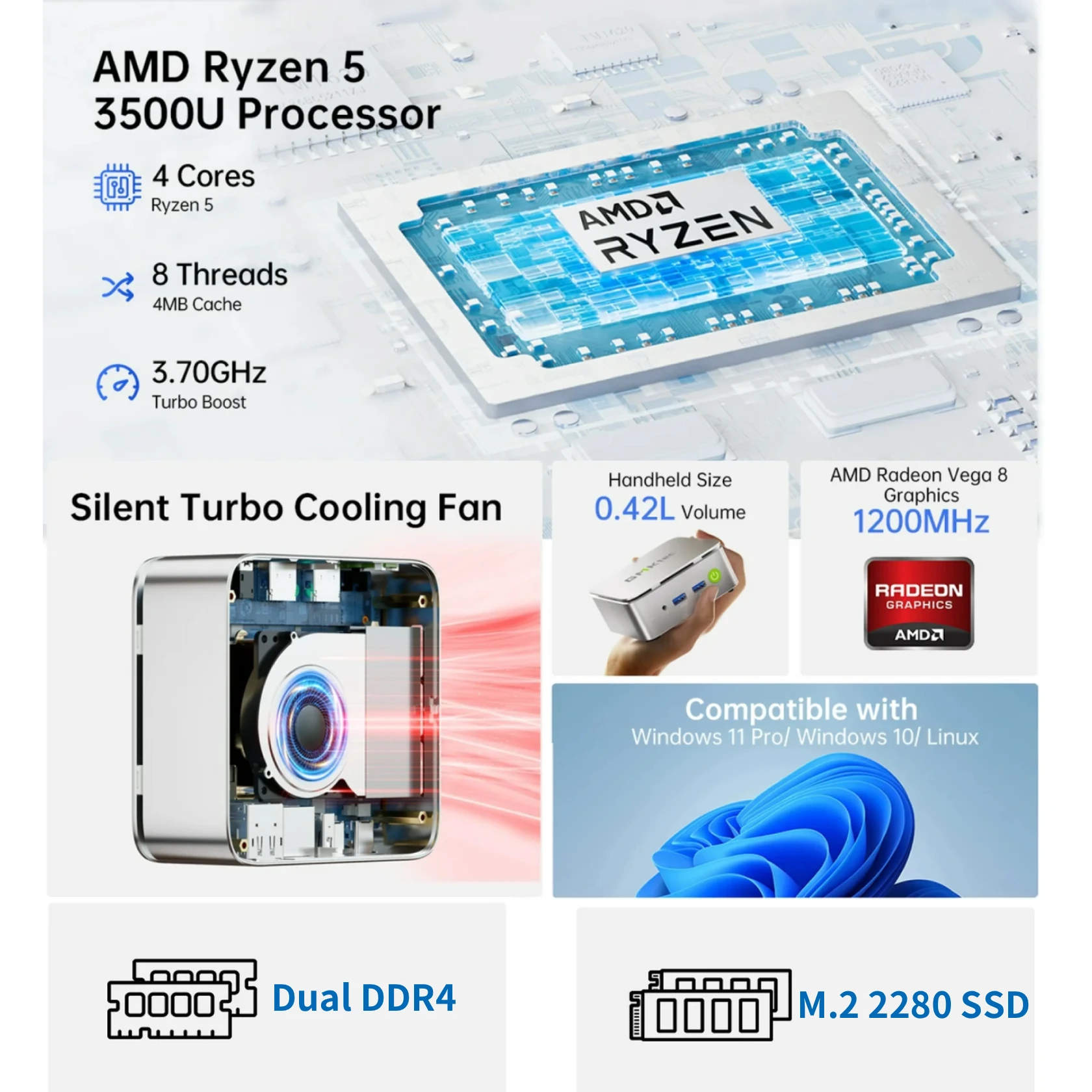 GMKtec G10 mini pc equips with 4-core/8-thread AMD Ryzen 5 3500U, featuring a base frequency of 2.1GHz and a boost frequency that can reach up to 3.7GHz.