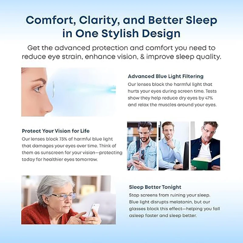 2. Advanced Blue Light Protection:Specially designed lenses filter harmful blue light from screens and bright environments, reducing eye strain during extended computer use or outdoor activities.