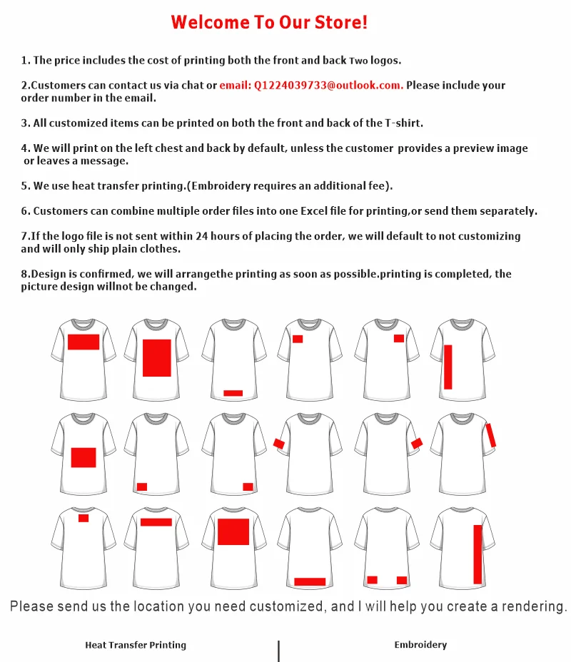4. We will print on the left chest and back by default, unless the customer provides a preview image