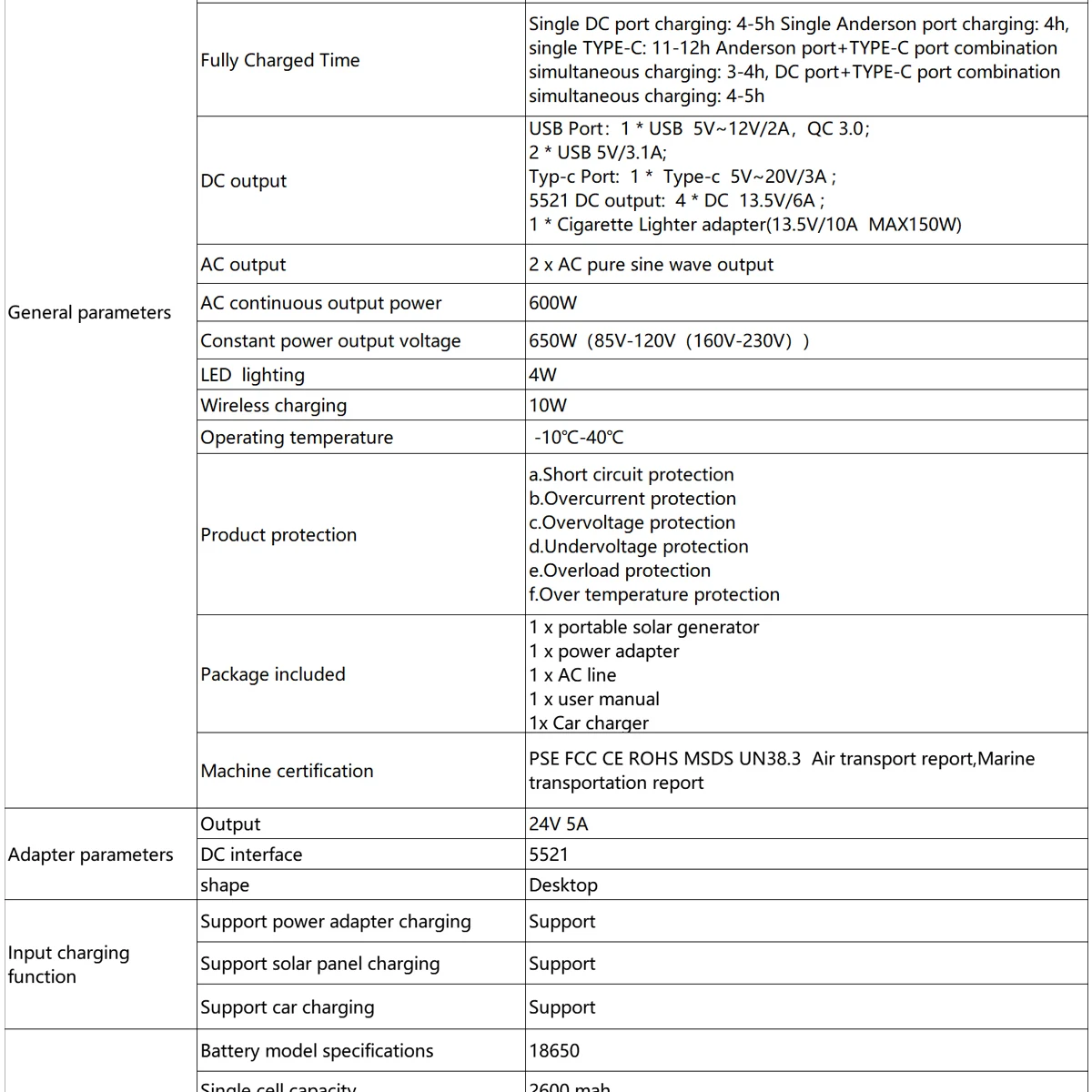 - DC Output: 1 USB,2 USBs,1 TYPE-C, 4 DC, Cigarette Lighter Adapter
