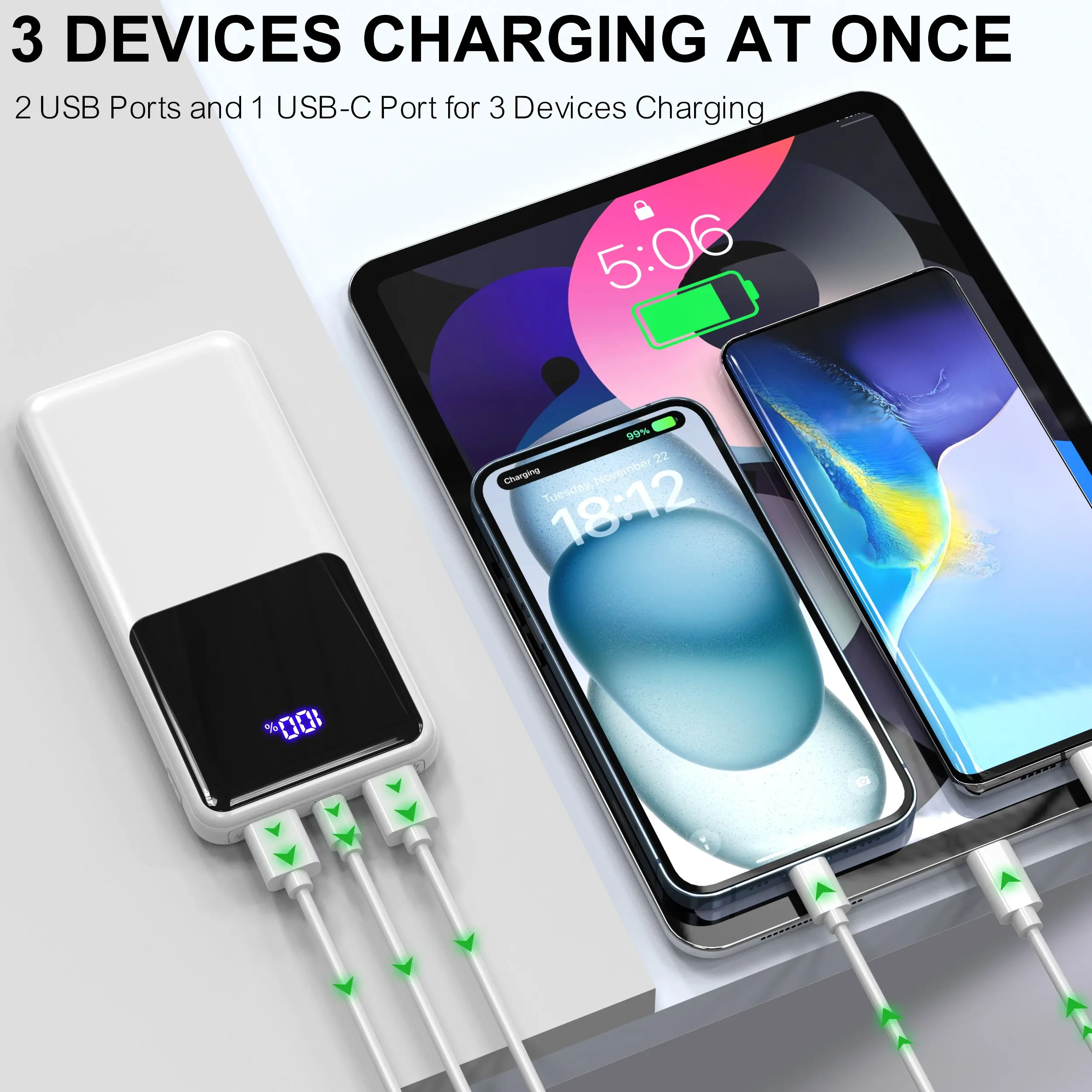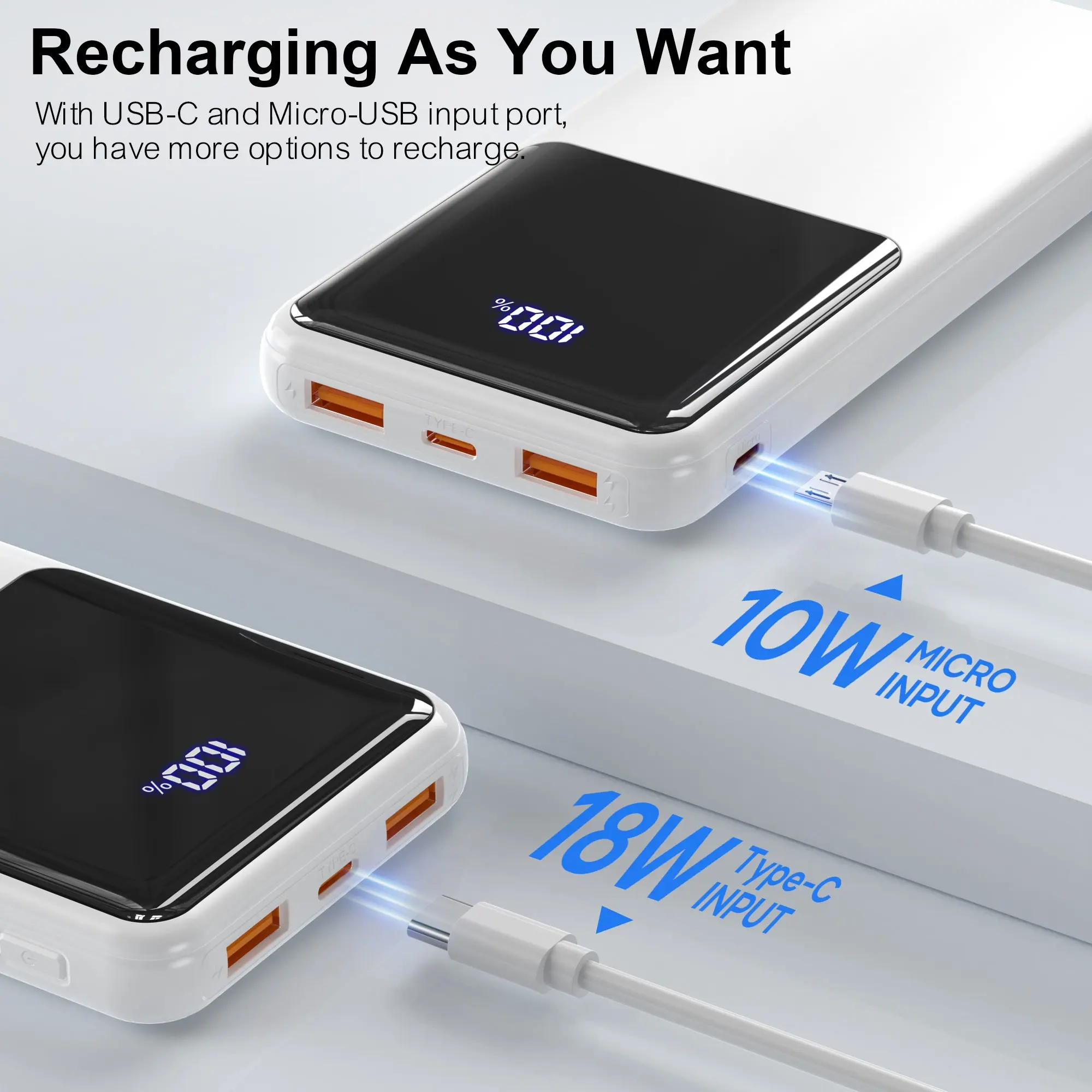 Use the Type-C port for input (recharging) or output (charging)—flexibility to power the bank or your devices with one cable. Maximizes convenience for on-the-go lifestyles. -
