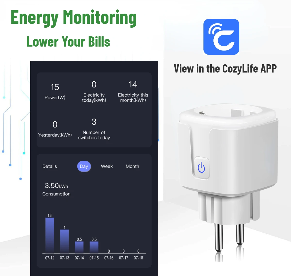 Smart Plug WiFi EU With Energy Monitor 16A Electric Socket CozyLife APP Control High Power Outlet Support Alexa Alice 220V 110V