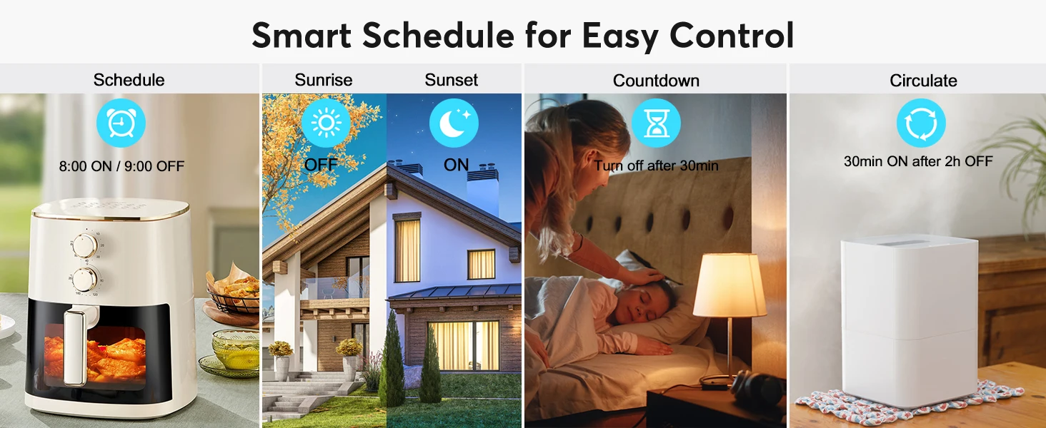 & : This Alexa-compatible smart timer plug allows for customized schedules, enabling automatic control of devices based on your daily needs. It's perfect for appliances like electric kettles, printers, fans, Christmas lights, lamps, coffee makers, and humidifiers, making your life more convenient and efficient.